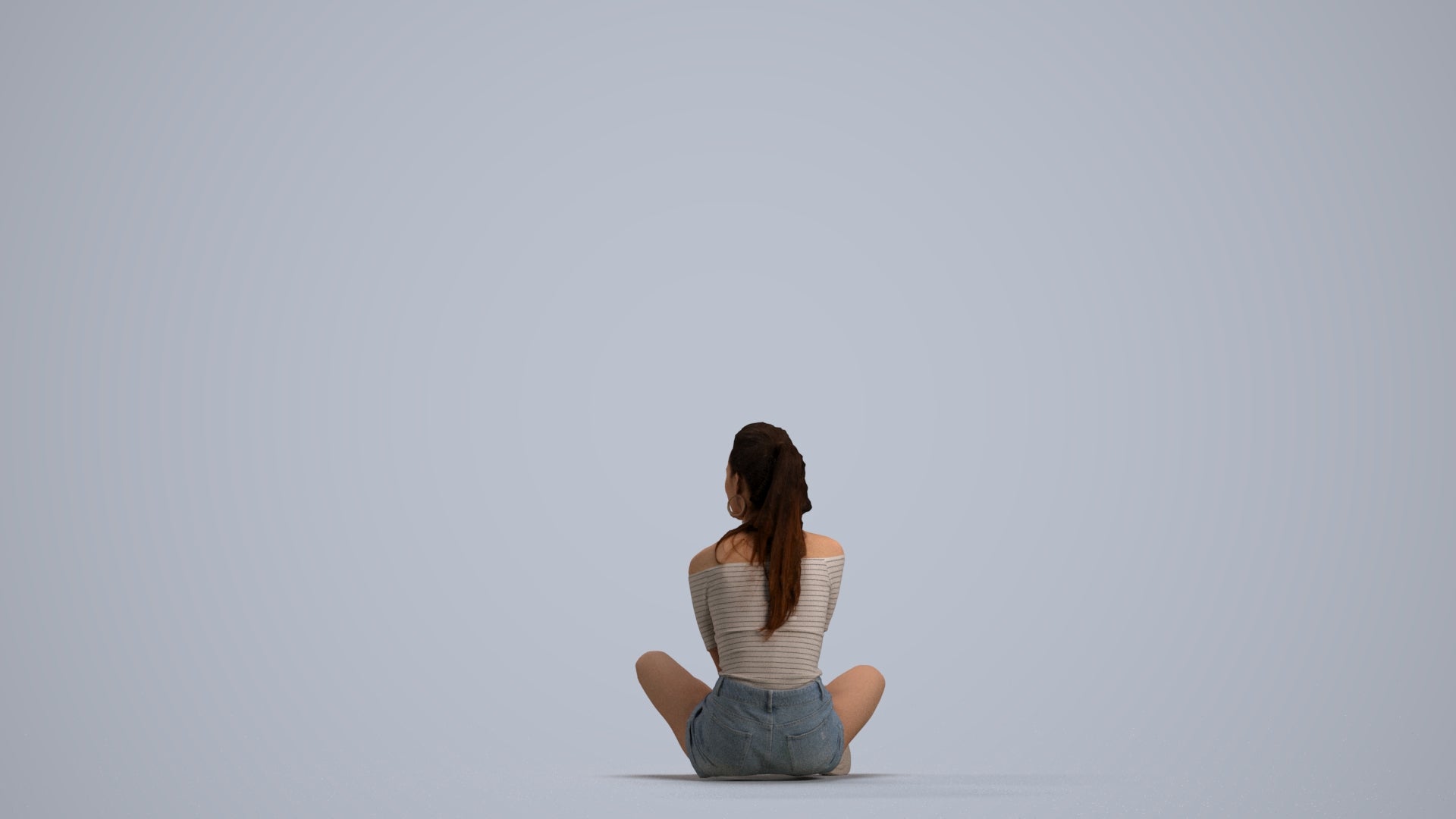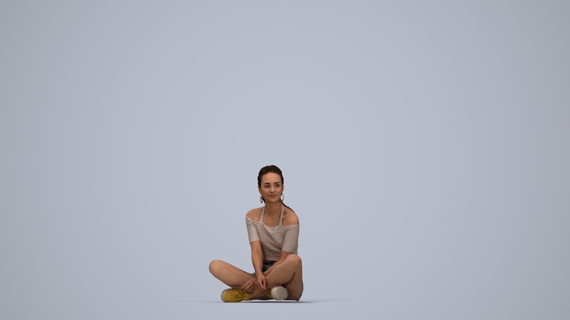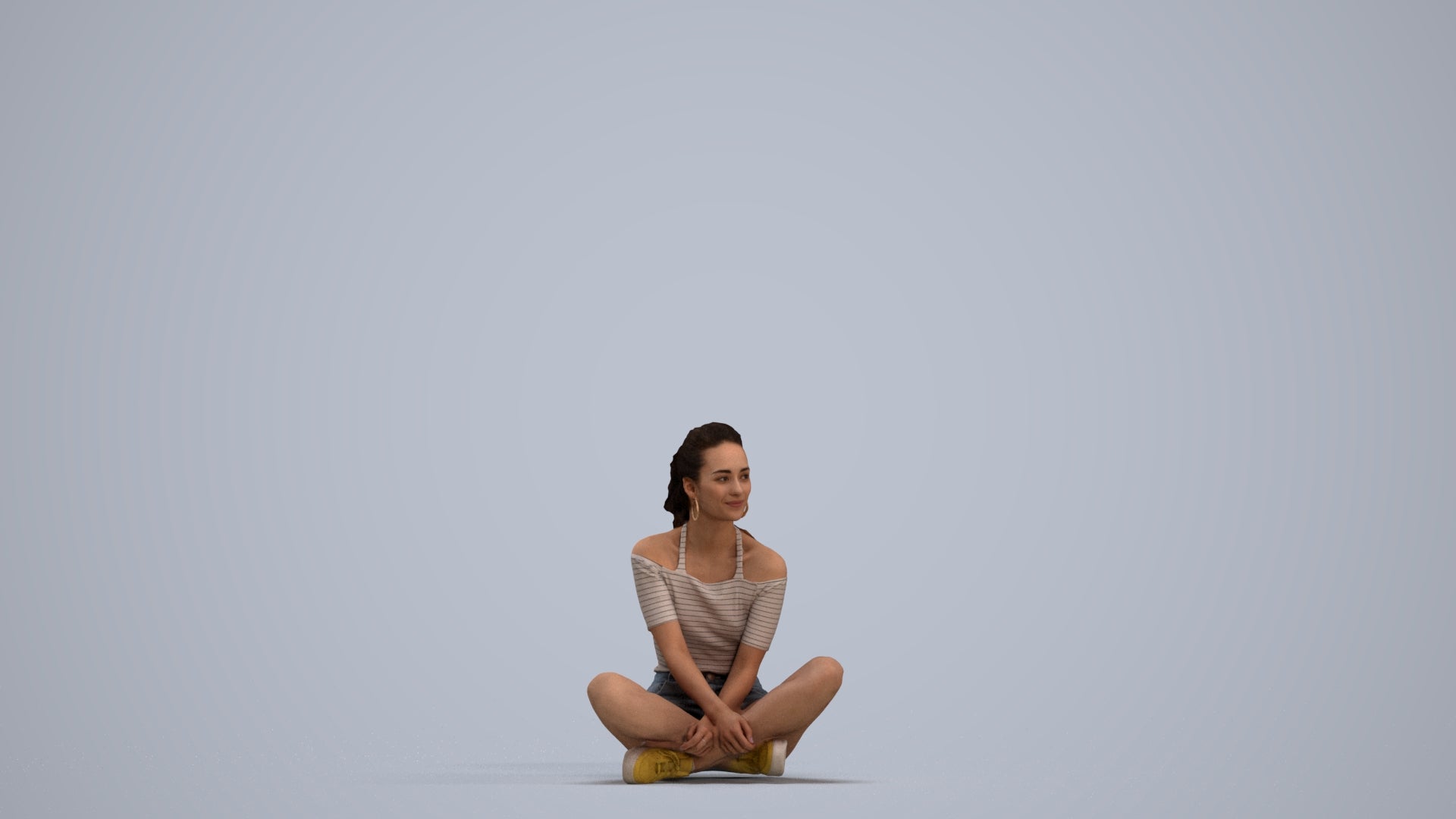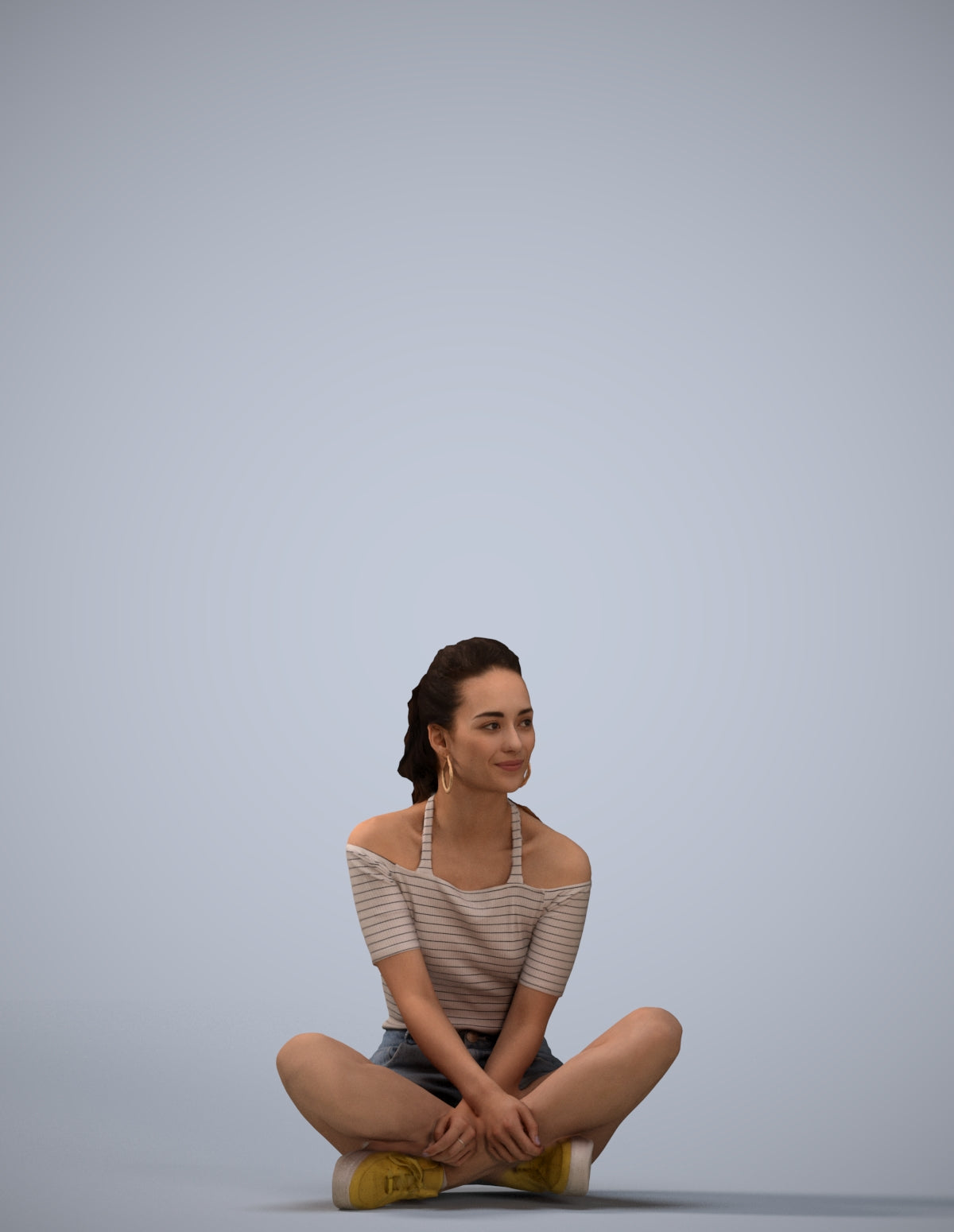 female, adult, caucasian, sitting, casual, summer, home, relaxing, 1_people, summerwear, 00302_Hideki008, woman, seated, resting, leisure, crosslegged, cross-legged, floor, ground, comfortable, chill, lounging, sit, pose, indoor, lifestyle, cozy, peaceful, calm, denim, shorts, striped, shirt, young, ponytail